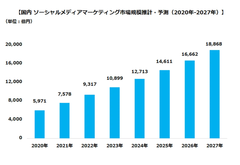 サイバー・バズとデジタルインファクトが行った市場動向調査によると、企業がソーシャルメディアを活用したマーケティングを目的とする年間支出額は、2022年は9,317億円となり、2023年は1兆899億円で前年比117%の見通しとなっています。2027年には2023年比で約1.7倍の1兆8,868億円に達する予測です。
